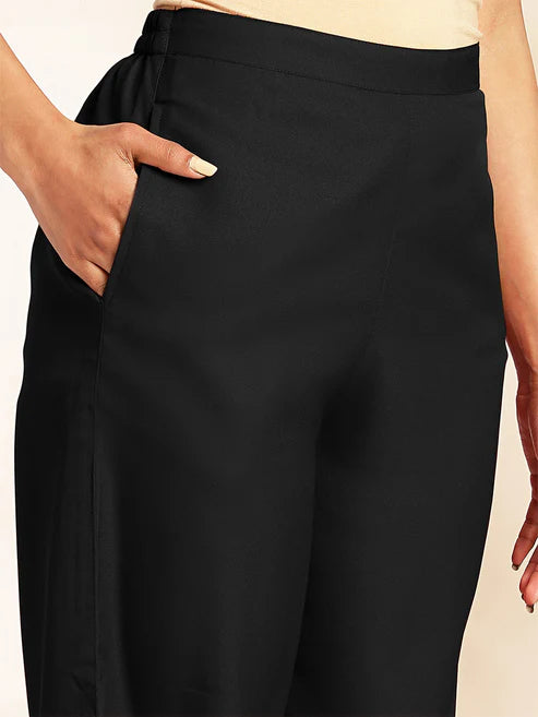 Step into festive elegance with this stunning Black Solid Crop Top with Pant and Jacket set from Saheli Collections, designed to radiate sophistication and timeless charm. Crafted from smooth crepe fabric, the solid black crop top and matching pants create a smart and polished foundation for your look.