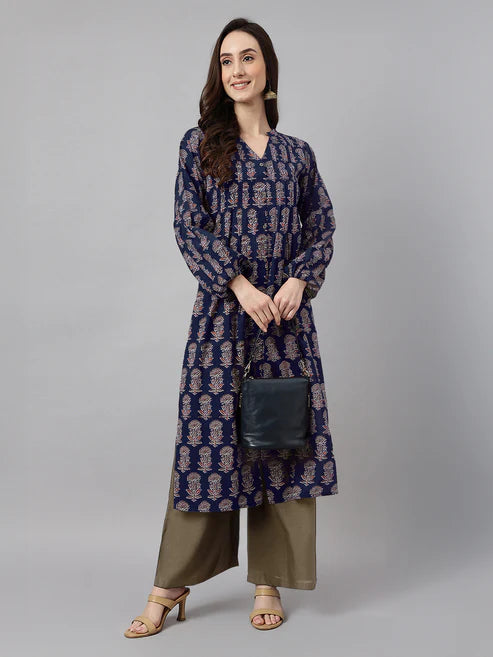 Saheli Navy Blue Pure Cotton Floral Printed A-line Kurta