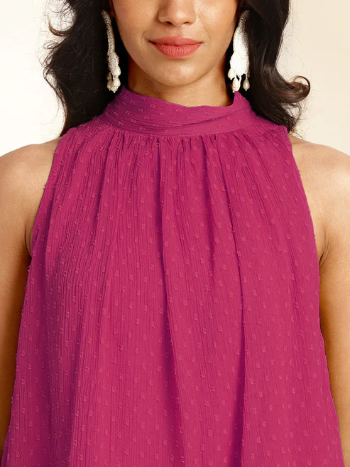 Step into effortless glamour with this lustrous pink halter neck co-ord set from Saheli Collections. Crafted from delicate pink dobby chiffon, this ensemble features a captivating self-design texture that adds depth and elegance to your overall look.