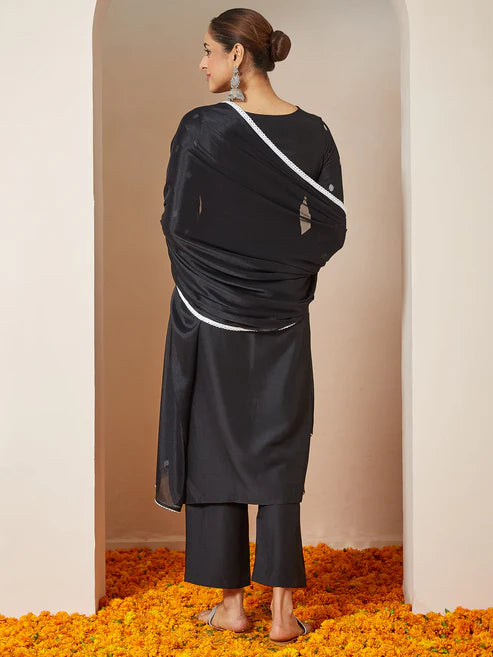The kurta is paired with solid black straight pants in a silk-blend fabric, featuring a semi-elasticated waistband and a convenient side pocket for all-day comfort. Completing the look is a graceful black silk-blend dupatta, beautifully finished with delicate white lace detailing along the borders. Perfect for festive celebrations or elegant evening gatherings, this ensemble reflects the understated sophistication of Saheli Collections.
