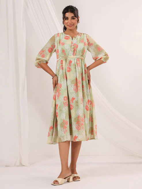 Saheli Women's Light Green Georgette Floral Printed A-line Dress