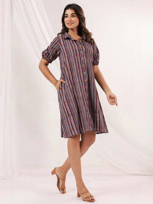Step into effortless style with this pure cotton A-line shirt dress from Saheli Collections, designed to make everyday dressing both comfortable and stylish. Featuring a striking hand-drawn stripe print in shades of navy, maroon, and ivory, this dress adds a bold yet sophisticated touch to your wardrobe.