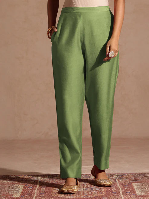 The ensemble is paired with a solid sage green narrow pant, tailored with a mid-rise fit, semi-elasticated waistband, and a practical side pocket for everyday comfort. Completing the look is a rich jacquard dupatta, embellished with gold zari motifs that elevate the festive appeal. Style this elegant set with traditional gold jhumkas and bangles for a radiant celebration-ready look, signature to Saheli Collections.