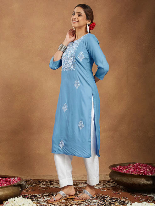 Refresh your ethnic wardrobe with this elegant sky blue straight-fit rayon kurta from Saheli Collections. Crafted in soft, breathable rayon fabric, this kurta features delicate embroidery that adds a touch of charm and sophistication to its minimal silhouette. Designed with a classic straight cut, it offers all-day comfort while maintaining a polished look.